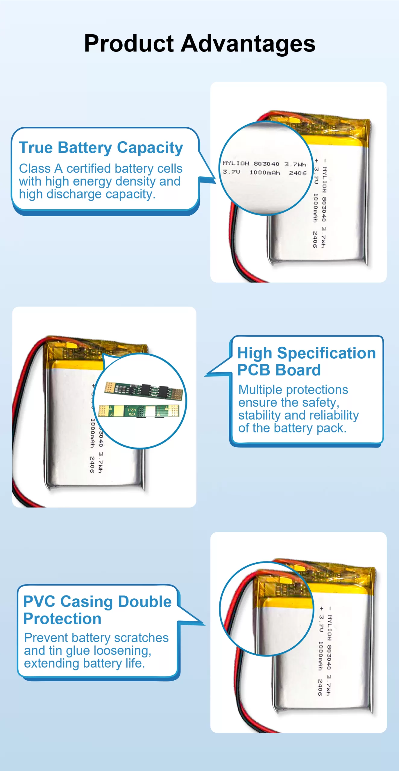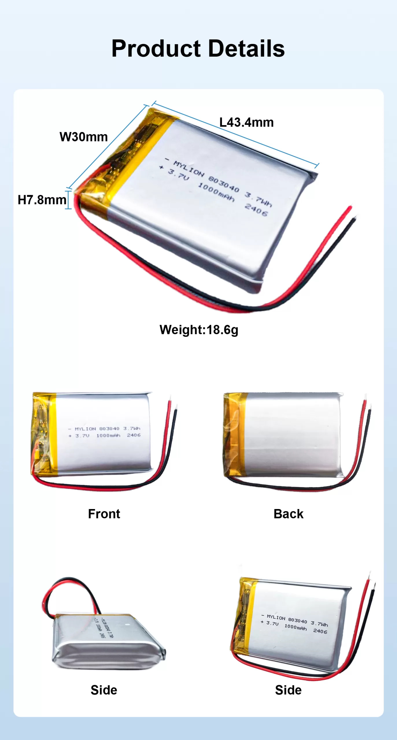 | Produktname | Lithium-Polymer-Akku 3,7 V 1000 mAh 803040 |