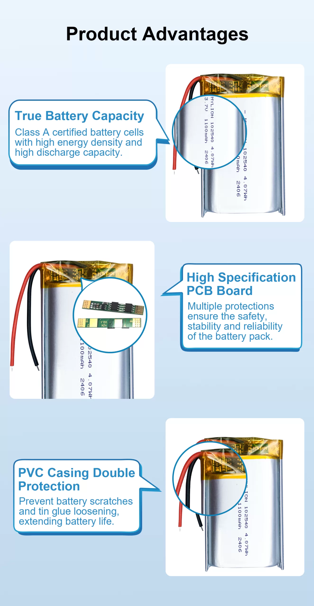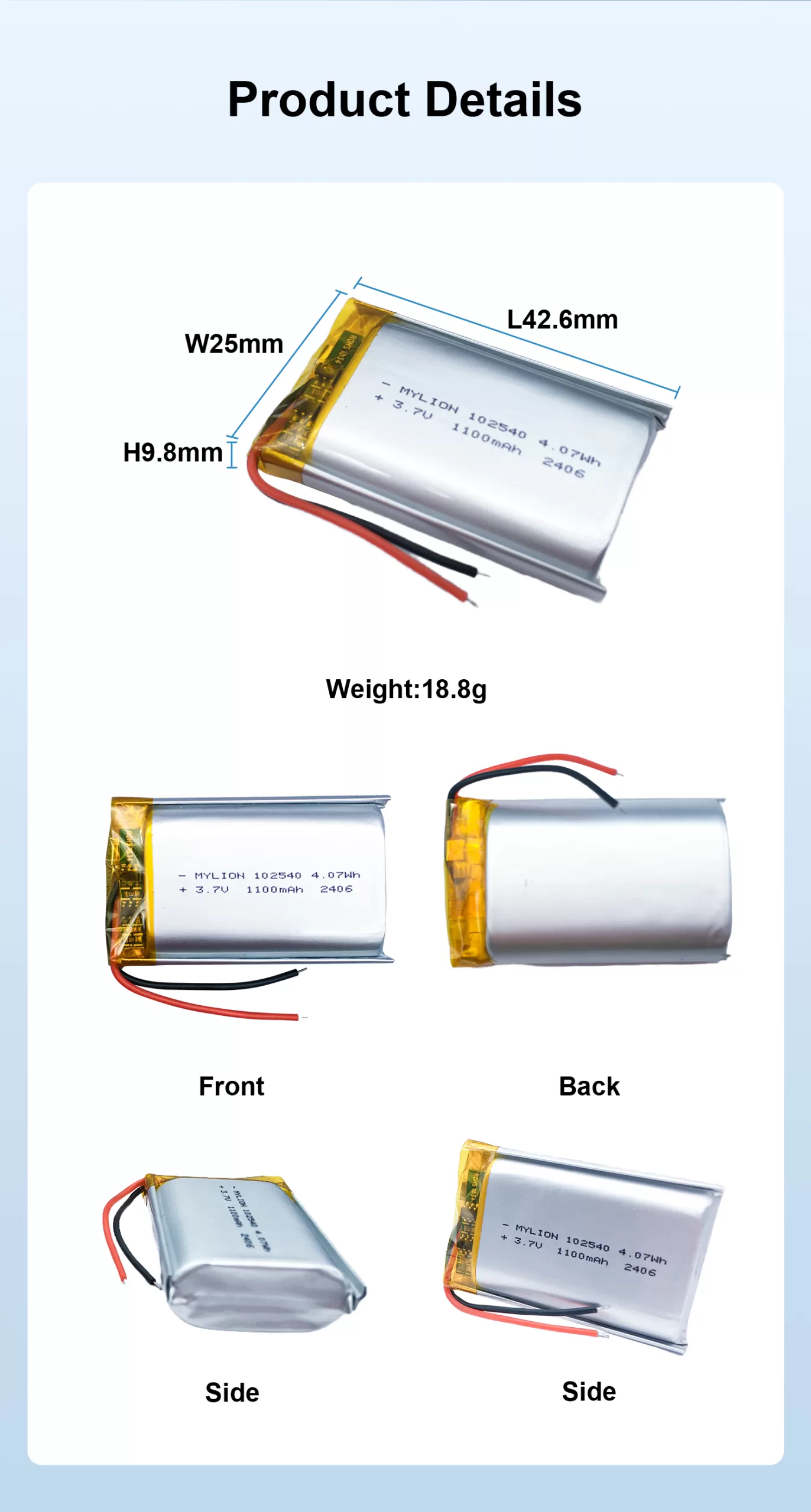 Model: 3.7V 1100mAh 102540