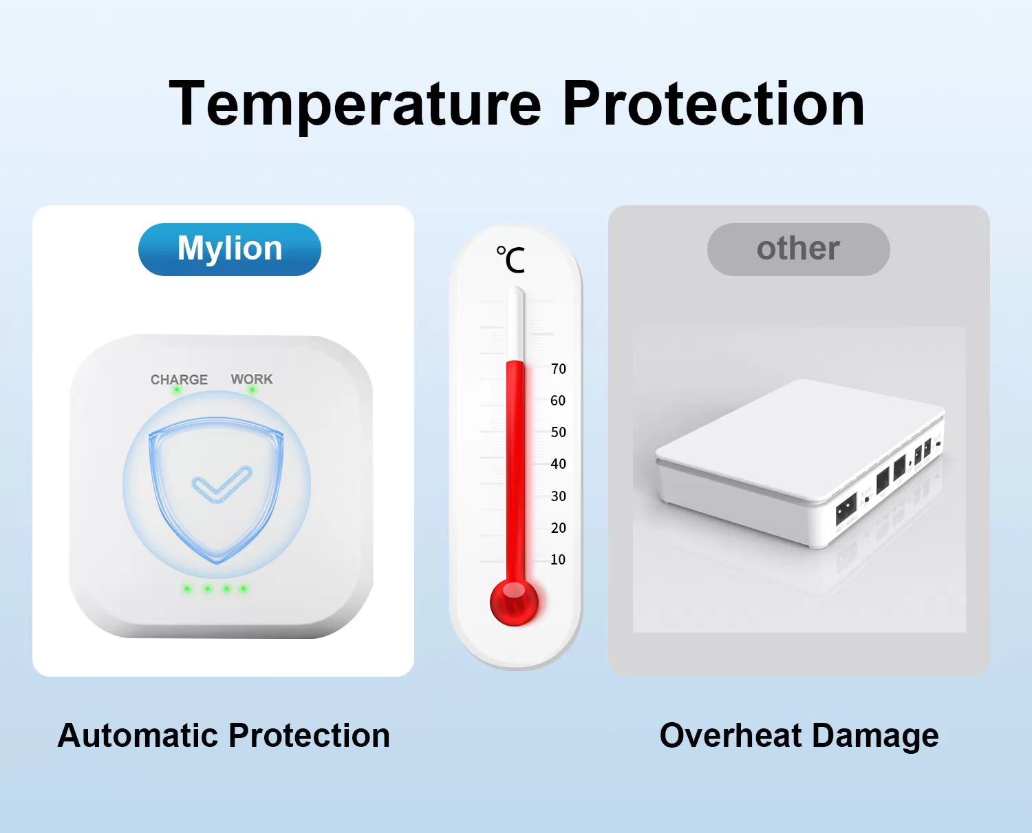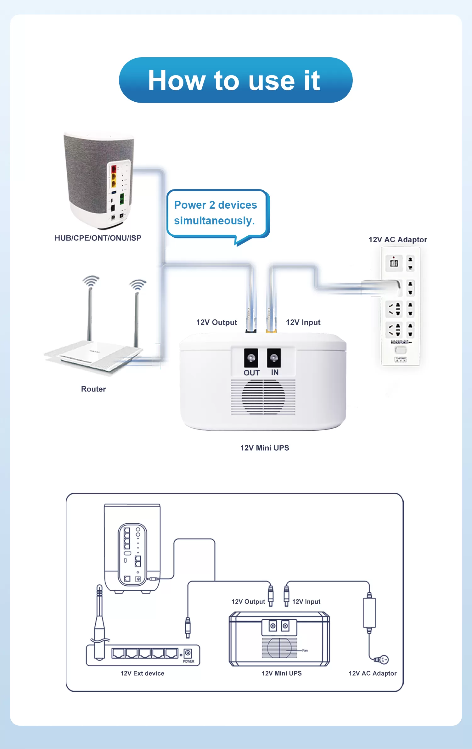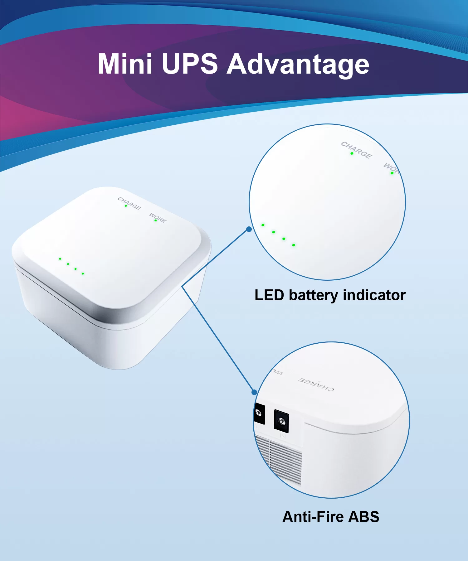 Mylion Mini UPS adopts an Anti-fire ABS plastic shell. It also has overcharge/over-discharge/current/short circuit protection and is equipped with a silent fan to dissipate heat for the mini UPS. There are 4 LED lights on the top to show the battery level. It can provide more than 14 hours of backup power for a 12V0.5A router.