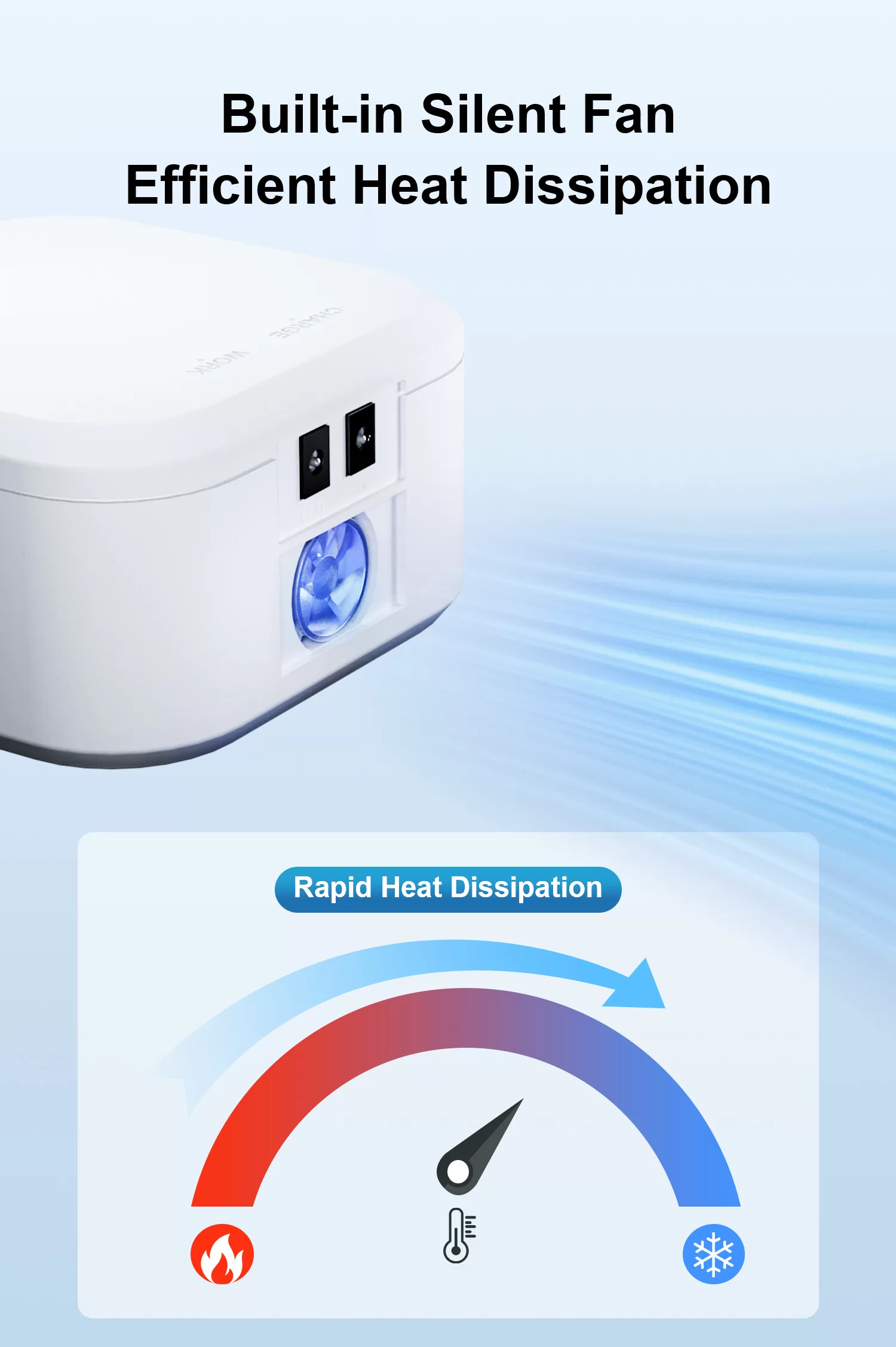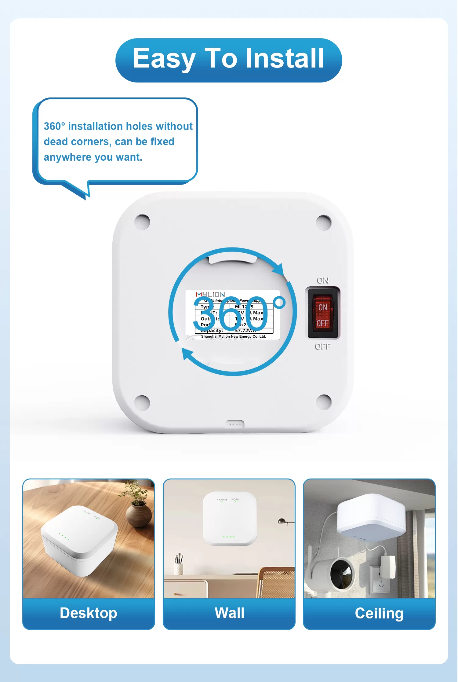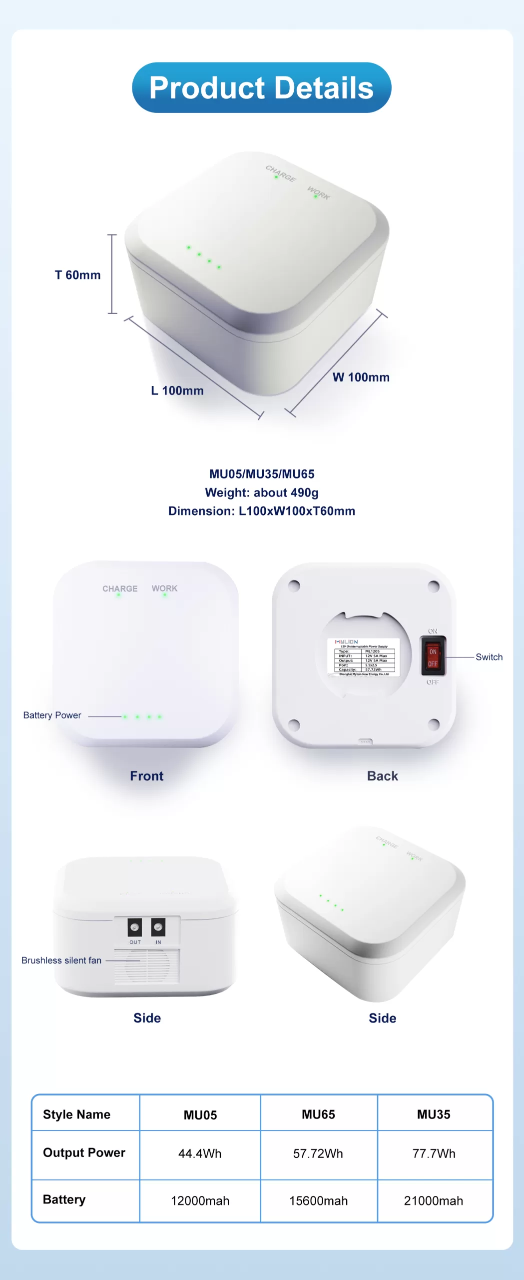 Mylion Mini UPS adopts an Anti-fire ABS plastic shell. It also has overcharge/over-discharge/current/short circuit protection and is equipped with a silent fan to dissipate heat for the mini UPS. There are 4 LED lights on the top to show the battery level. It can provide more than 14 hours of backup power for a 12V0.5A router.