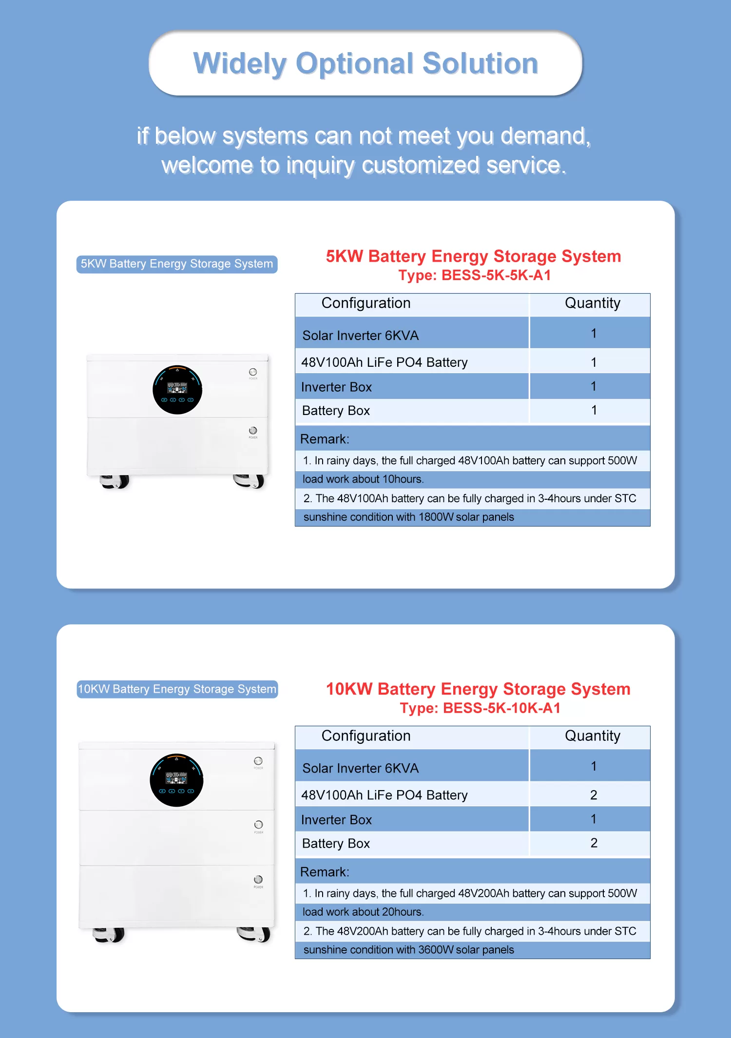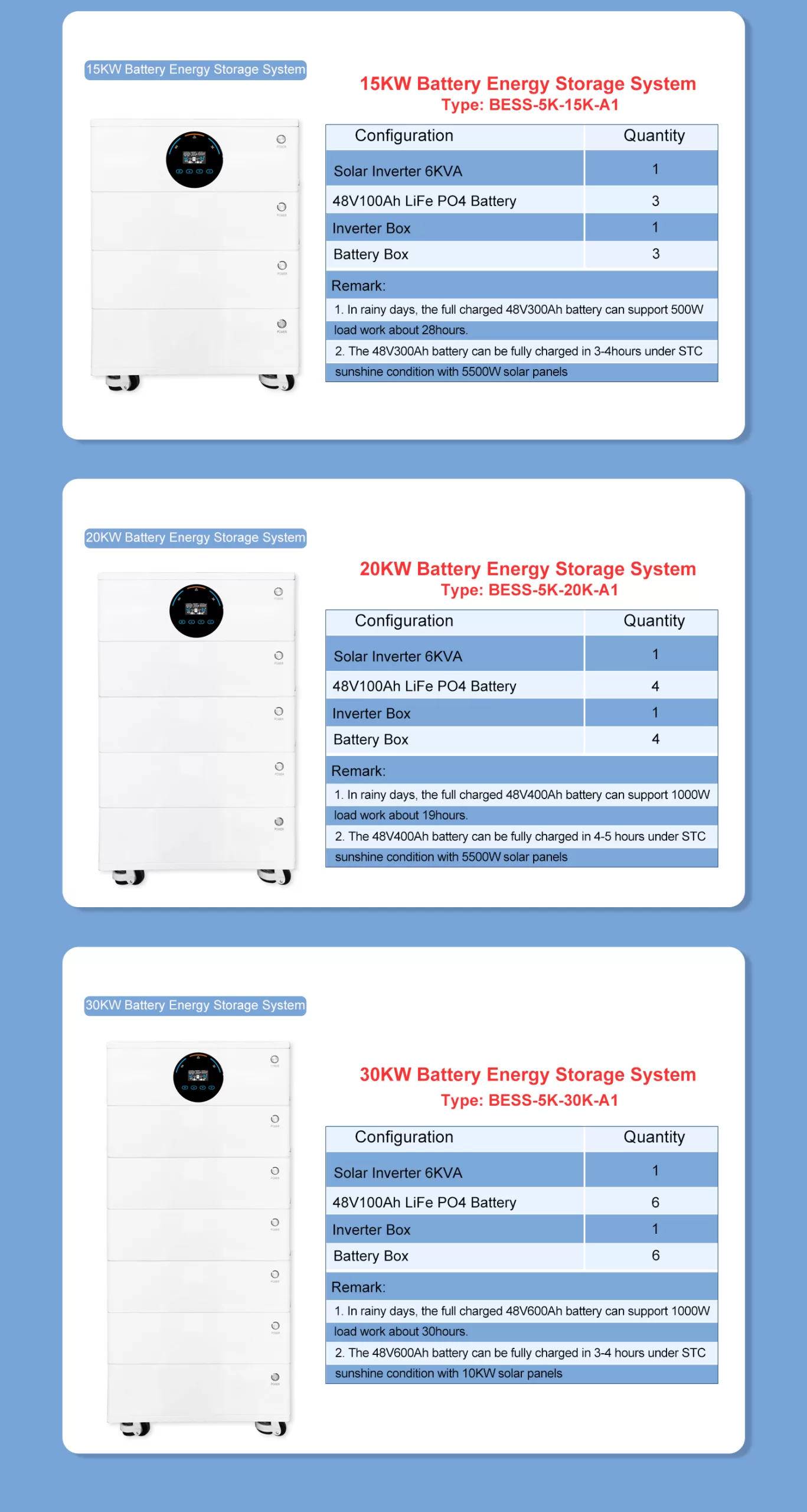 | Battery Capacity | 10KWh/48V200Ah | 15KWh /48V300Ah | 20KWh/400Ah |